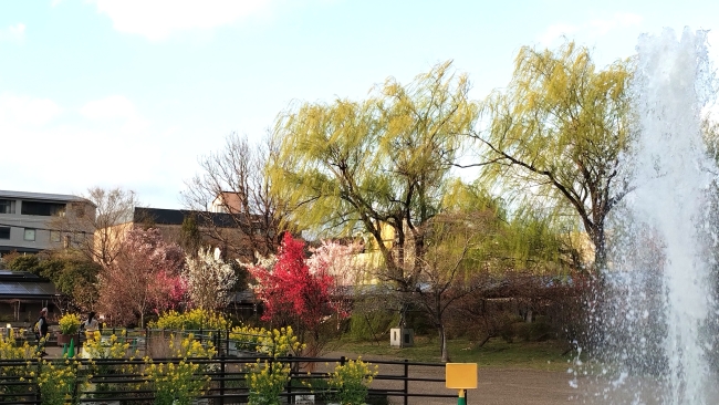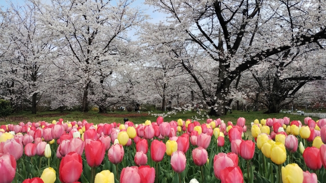 初旬には、チューリップのほか、サクラやモモの園芸品種が彩りを添えます。