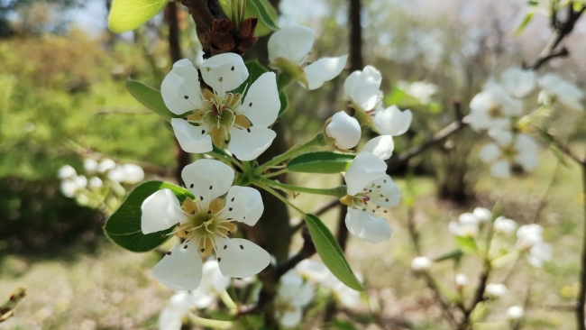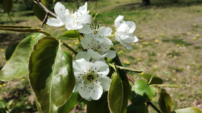 この時期園内には、ヤマナシ、セイヨウナシ、リンゴ、ボケなど、サクラの親戚も一気に咲きだします。花はみなよく似ていて、5枚の花弁が目立ちます。