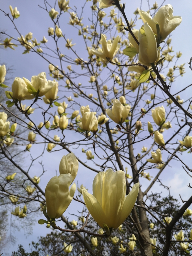 その後、ハクモクレンやコブシなどモクレン科の花が咲きだします。北山門近くには、ハクモクレンやコブシよりも花の色が少し黄色いキンジュモクレンという、北米原産の原種であるキモクレンから日本で選抜育成された園芸品種があり、樹木いっぱいに花を咲かせてなかなか見事な姿を見せてくれます。外見はチューリップと似ていますが、キンジュモクレンの花は花被片が9枚で、6枚しか花被片がないチューリップとは違います。