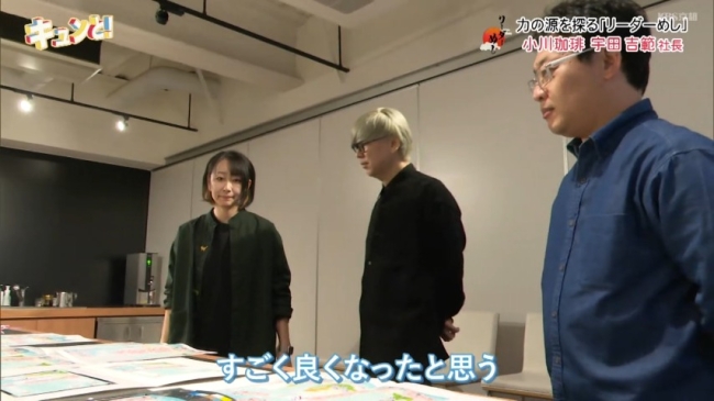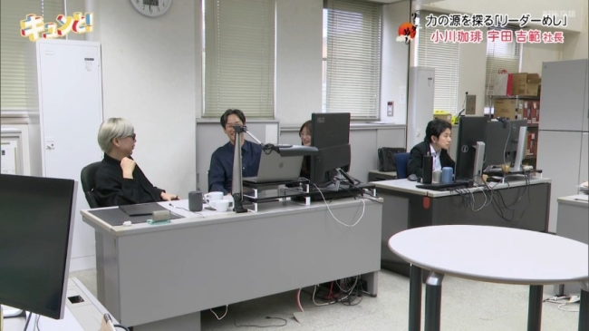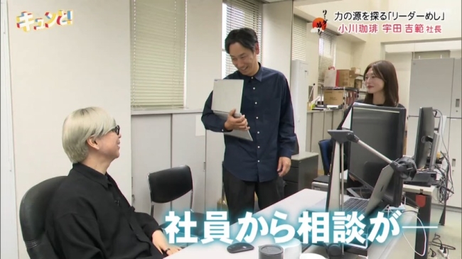 デザインチェックの後は、デスクに戻り一息…つくのかと思いきや、普段中々つかまらないという宇田社長に相談をと社員が訪れます。